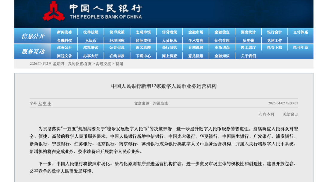 4月2日,央行发布消息称,为贯彻落实“十五五”规划纲要关于“稳步发展数字人民币”的决策部署,进一步提升数字人民币服务的普惠性,持续响应人民群众对安全、便捷、高效的数字人民币服务需求,新增中信银行、中国光大银行、华夏银行、中国民生银行、广发银行、浦发银行、浙商银行、宁波银行、江苏银行、北京银行、南京银行、苏州银行为银行类数字人民币业务运营机构,并接入央行端数字人民币系统。新增机构将在完成业务、技术准备后开展数字人民币业务。