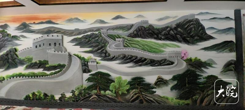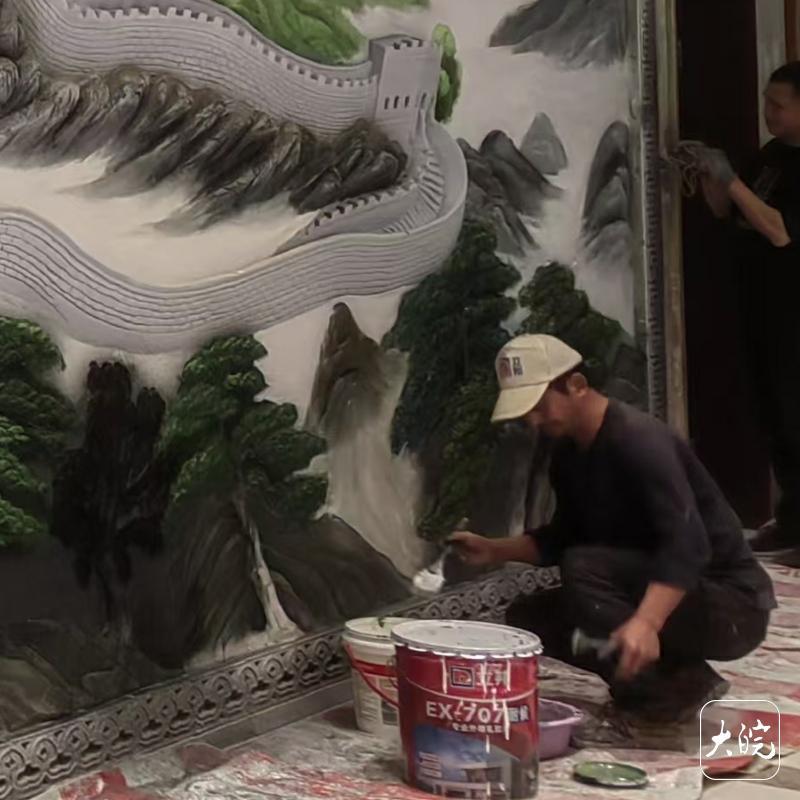 几天前,舒振海为石台一家酒店完成一幅总面积20余平方米的长城墙绘。舒振海介绍,做墙绘浮雕首先要在墙上画出轮廓,接着用石膏堆出一定的厚度,再刻画细节,最后填上色彩、搭配灯光,看上去才会有立体感和视觉冲击力,比一般平面的画作更有质感。