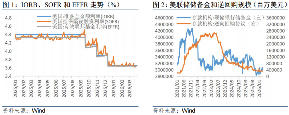 2025年11月末,美国存款机构准备金余额一度降至2.88万亿美元,较2021年9月峰值下降31%,占2025年四季度GDP现价折年数的比重为9.16%。按照美联储理事沃勒的看法,9%就是储备不足的阈值。同时,提供过剩流动性的逆回购工具(ONRRP)余额截至启动RMP前已降至3300亿美元左右,较2023年4月峰值2.68亿美元下降近90%,缓冲资金几近耗尽。