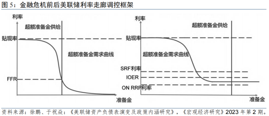 金融危机前,美国货币政策利率走廊上限为贴现率,下限为超额存款准备金利率(IOER),即为0,不过此时利率走廊调控作用相对有限,因为美联储可以通过调整准备金来更加精准地调控利率。随着存款机构准备金极度充裕,美联储通过公开市场操作影响准备金供给、进而调控利率的逻辑失效,为了让联邦基金利率能够向政策目标靠拢,美联储逐步设置了两个关键政策利率作为利率下限。2008年美联储开始为超额存款准备金支付利息,试图让IOER成为“地板”。但现实中,由于市场中非银机构(如房利美、房地美)持有大量无息准备金,可以低于准备金利率的价格出借给银行,故联邦基金利率绝大部分时候是在IOER下方运行。2013年美联储推出了隔夜逆回购协议(ON RRP),将其利率下限的作用范围扩展到非银机构。而在充足准备金框架下,IOER反而成为了利率上限,并与ON RRP利率一同组成更狭窄的“走廊”。ON RRP利率、IOER以及后期的IORB基本上就是跟随联邦基金目标利率上下限变动,并且二者构成的区间范围比联邦基金目标利率区间更窄。联邦基金利率大体上就在这更窄幅的区间内波动,并随着政策利率的调整而调整,其变化受美联储公开市场操作及存款机构超额准备金规模变动的影响不大。